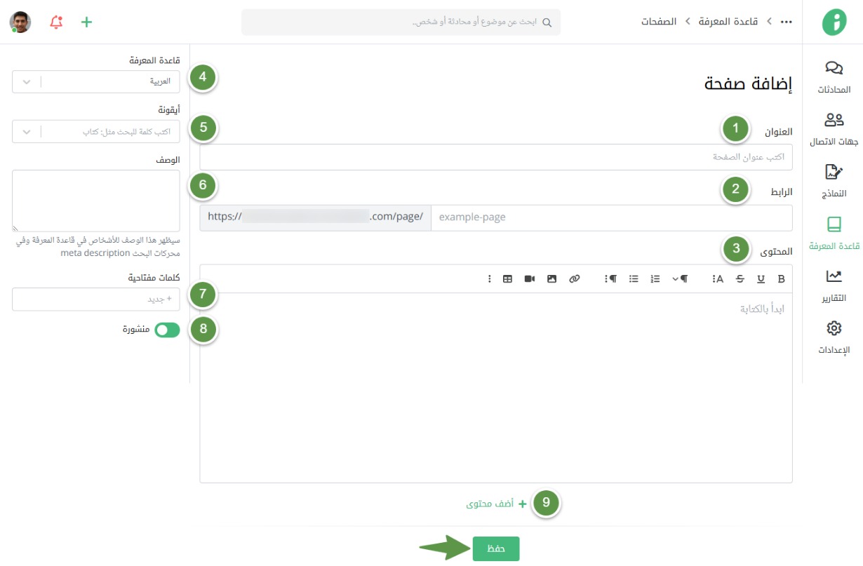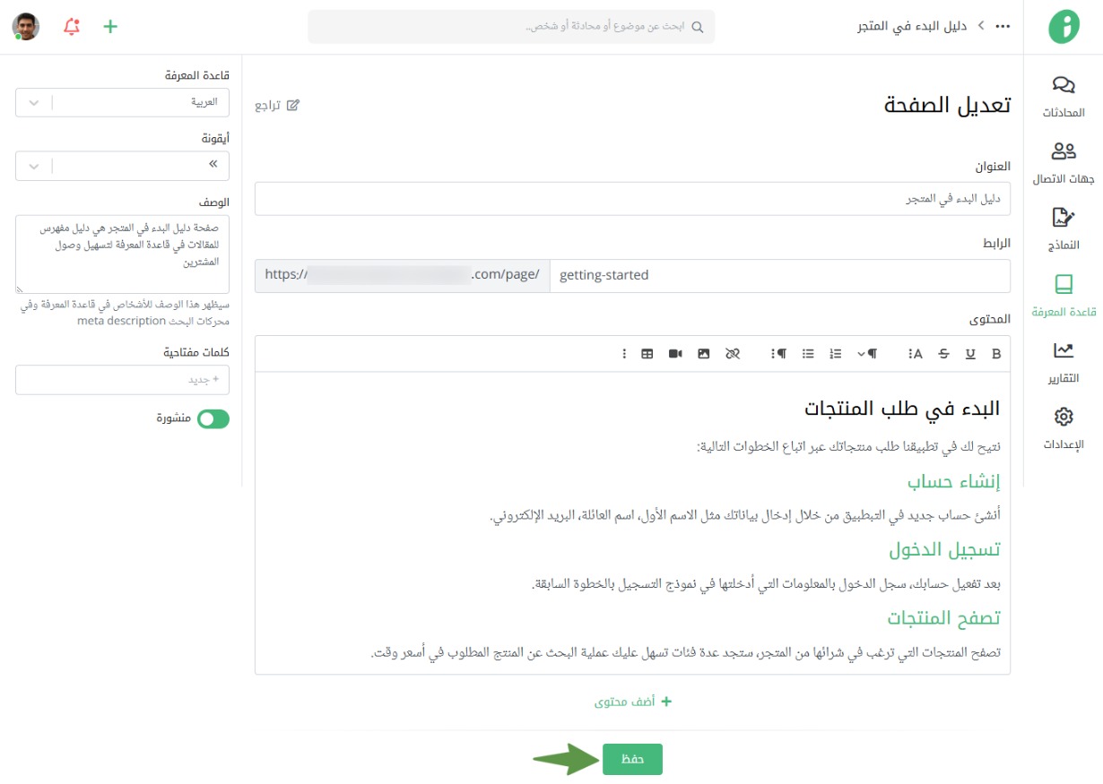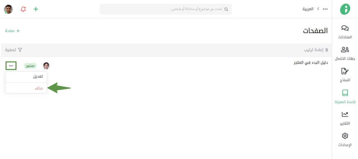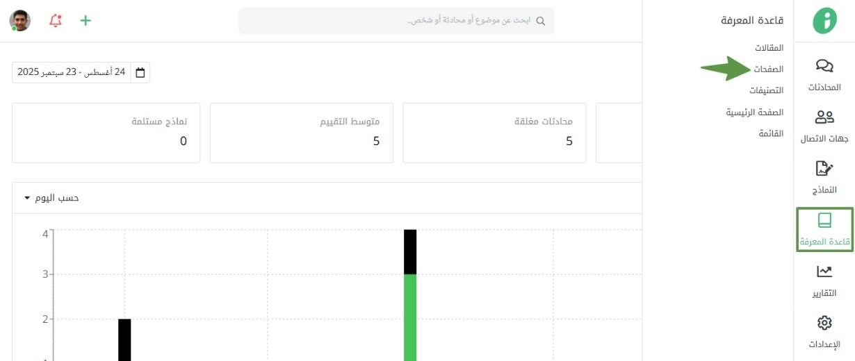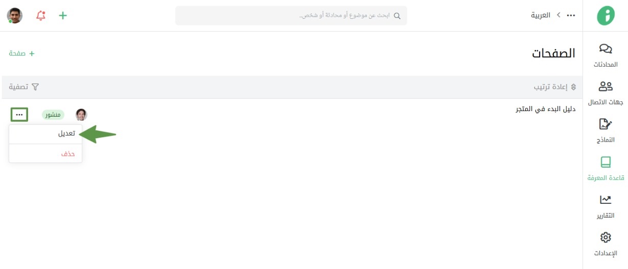 لتعديل صفحة، اضغط على قاعدة المعرفة من القائمة الجانبية، ثم اختر الصفحات.