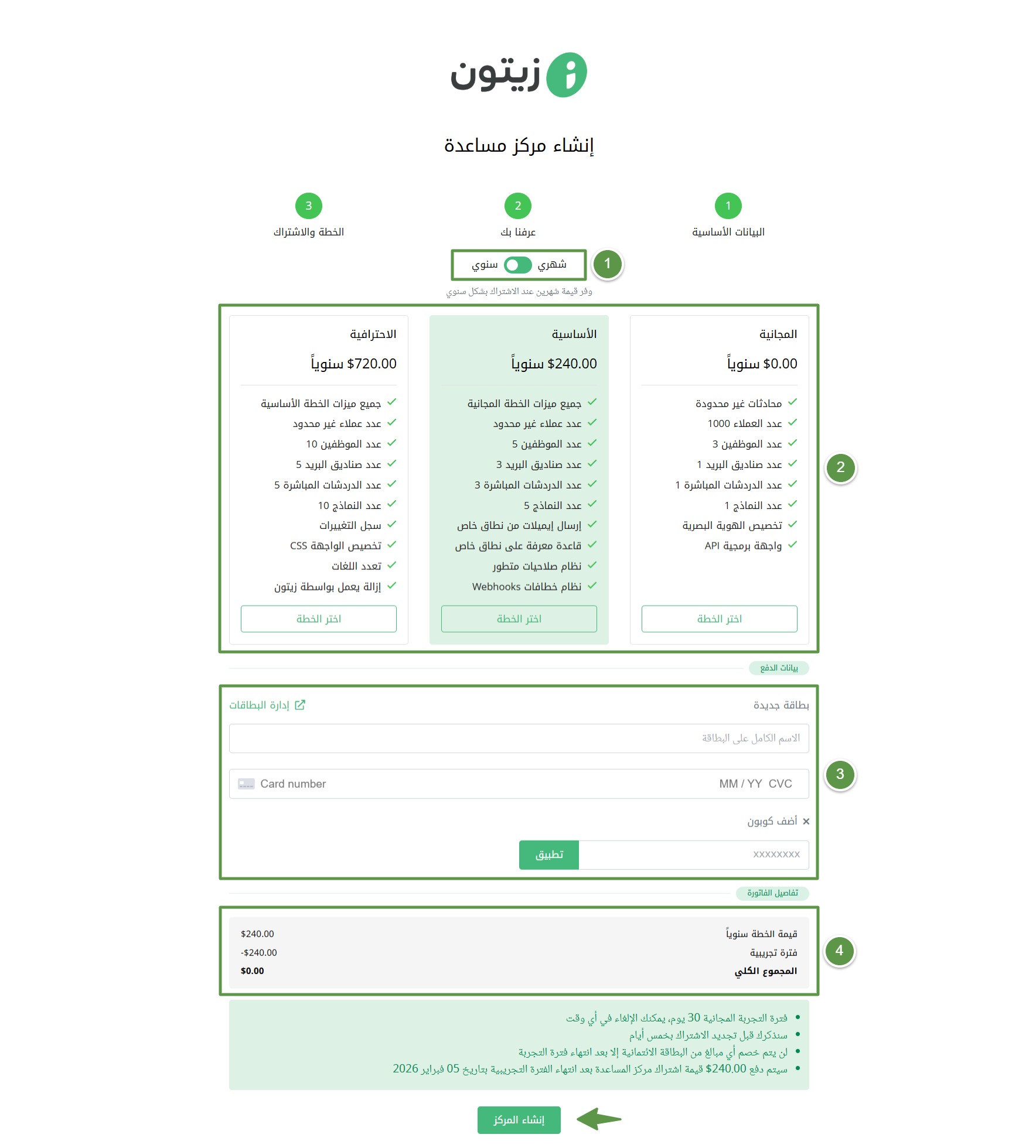 بعد تحديد الخطة المناسبة يعرض لك زيتون تفاصيل الفاتورة مثل قيمة الخطة والفترة التجريبية والمجموع الكلي.