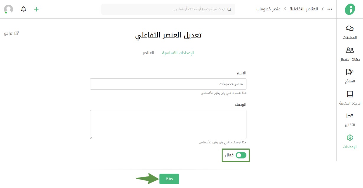 في تبويب الإعدادات الأساسية، بإمكانك إلغاء تفعيل العنصر التفاعلي بتحريك الأيقونة الموضحة، ويمكنك إعادة تفعيلها في أي وقت.
