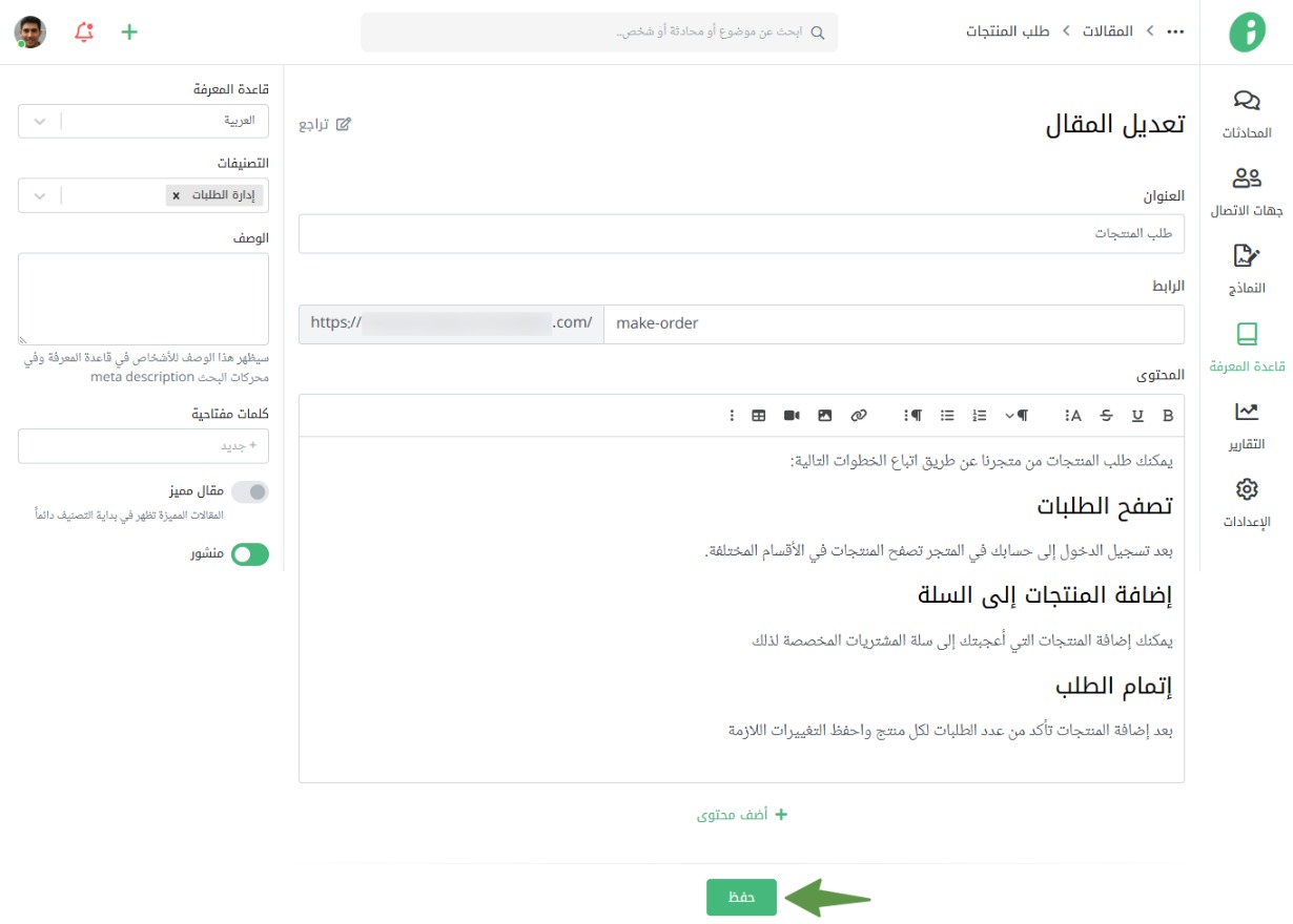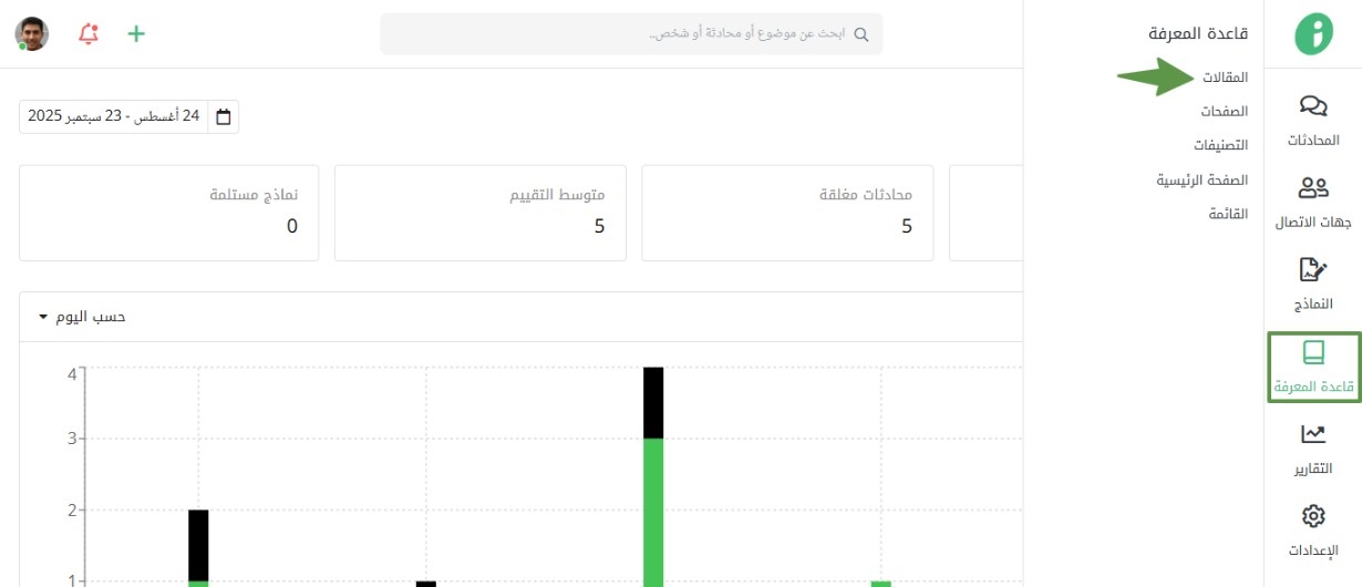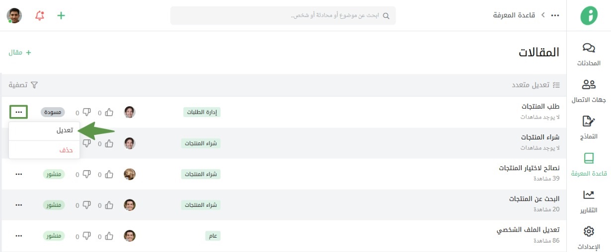 لتعديل مقال قمت بإضافته، اضغط على قاعدة المعرفة من القائمة الجانبية ثم اختر المقالات.
