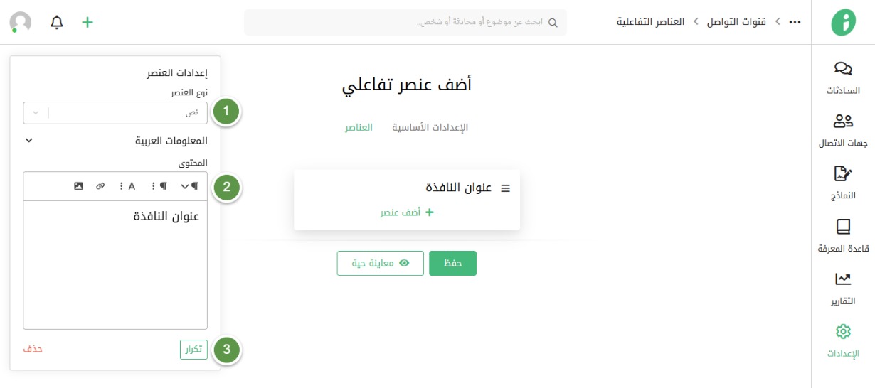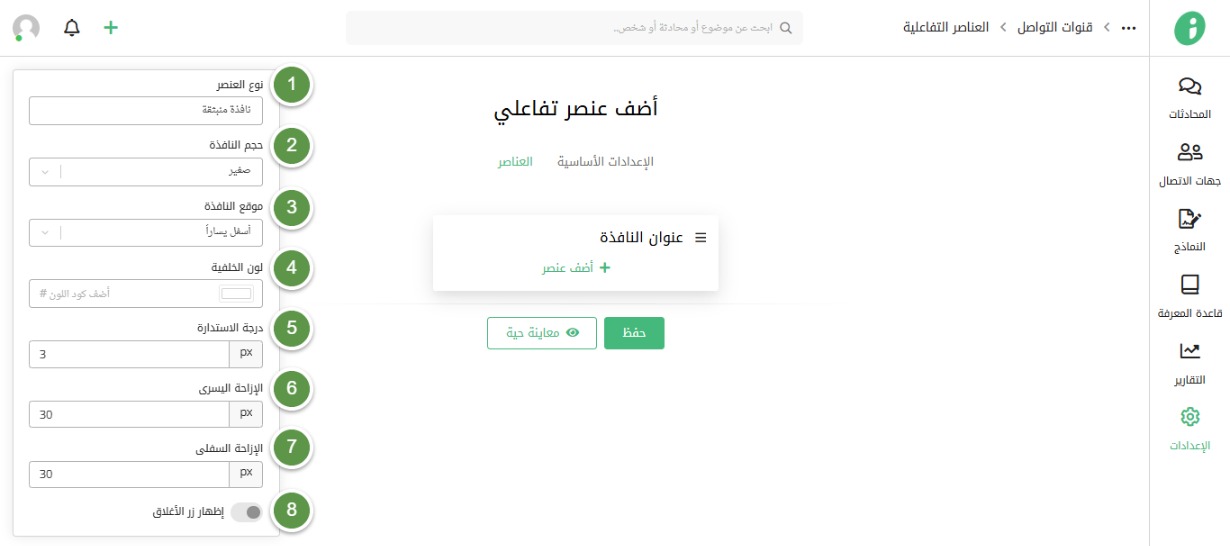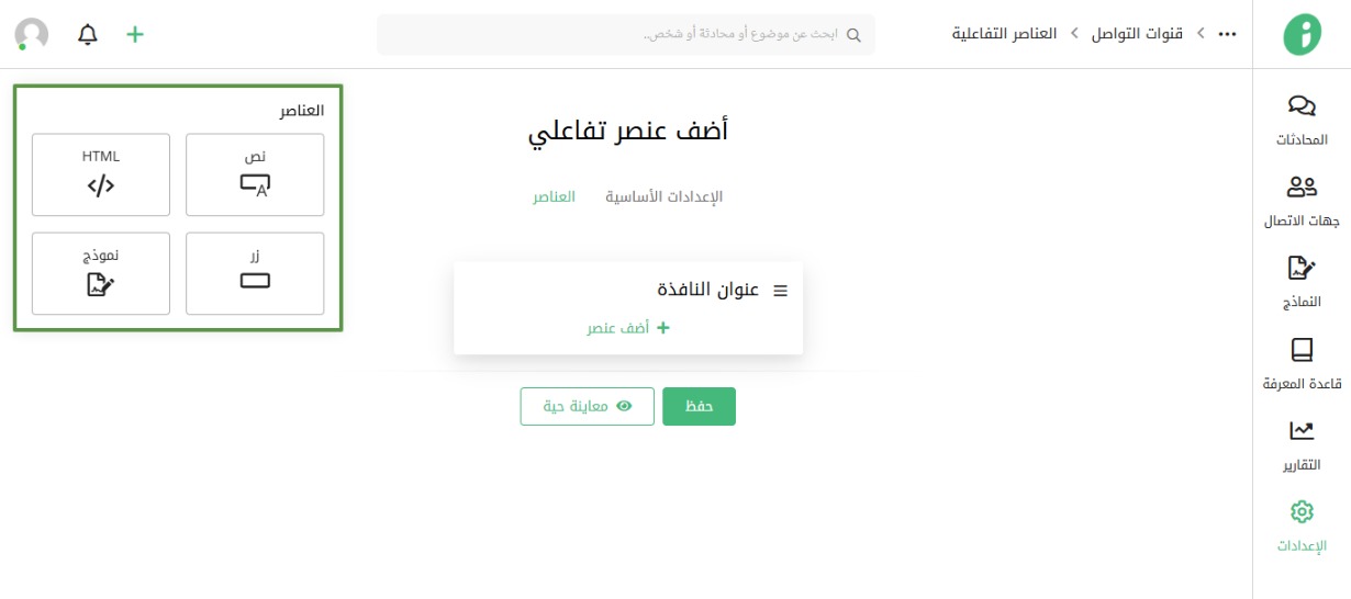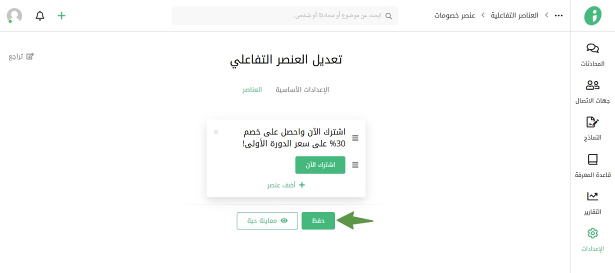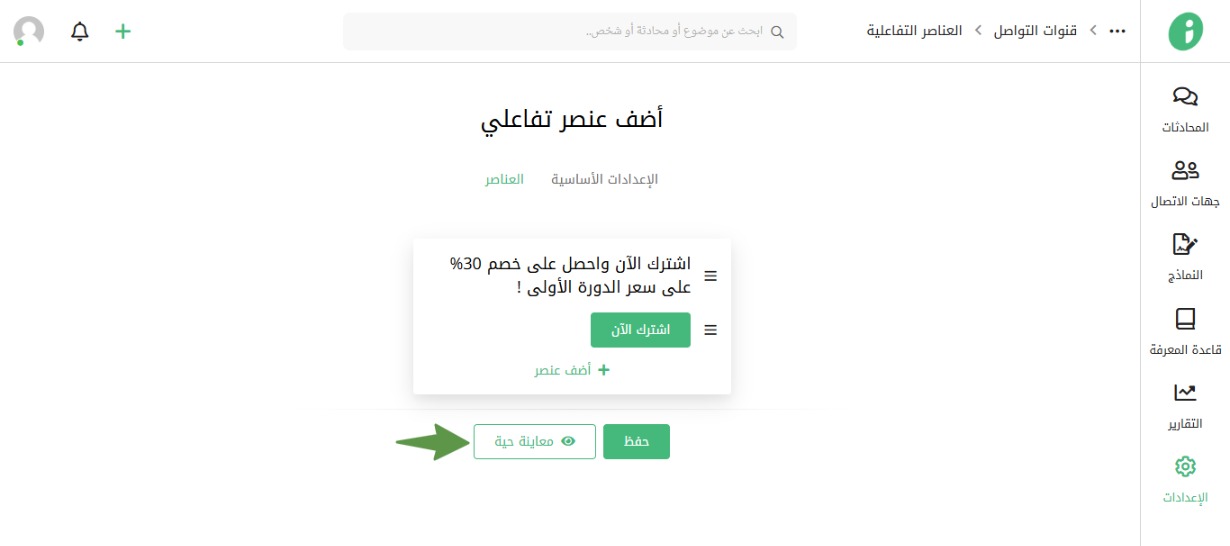 بعد ضبط إعدادات العنصر وإضافة المحتوى المطلوب، بإمكانك معاينة كيفية ظهوره في موقعك بالضغط على المعاينة الحية.
