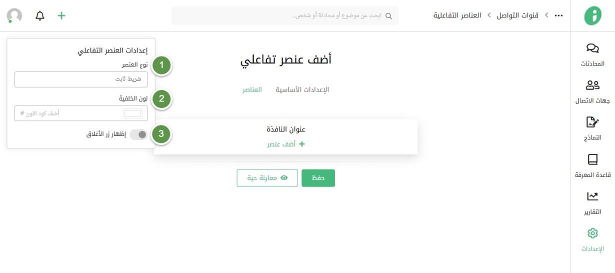 يمكنك إضافة أكواد HTML إلى العنصر التفاعلي لتظهر في موقعك، والتحكم بإعداداتها كالتالي: