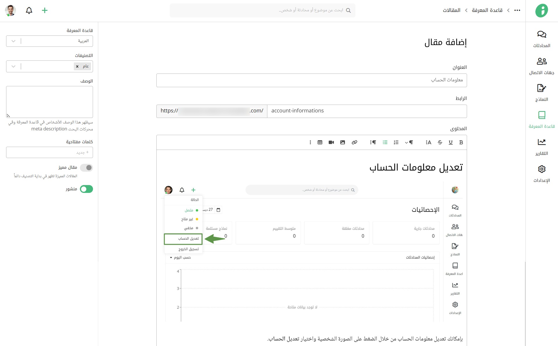 ابدأ بإعداد قاعدة المعرفة من خلال إضافة مقالات وتصنيفها أو إضافة صفحات بقاعدة المعرفة لتوجه العملاء حول كيفية استخدام موقعك أو تطبيقك.