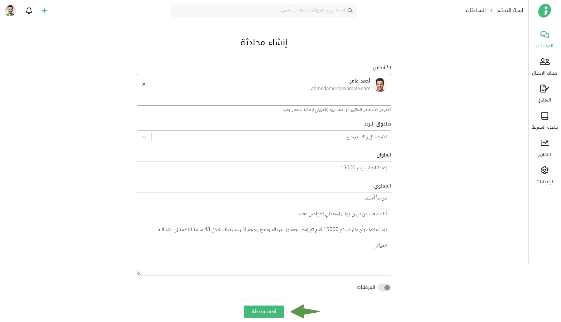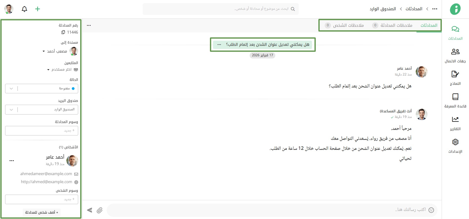 يمكنك إدارة المحادثات والرد عليها من خلال استخدام أدوات متقدمة كتعديل العنوان وإسناد ومتابعة المحادثات وإضافة الملاحظات وتحديد حالة المحادثة والمزيد.