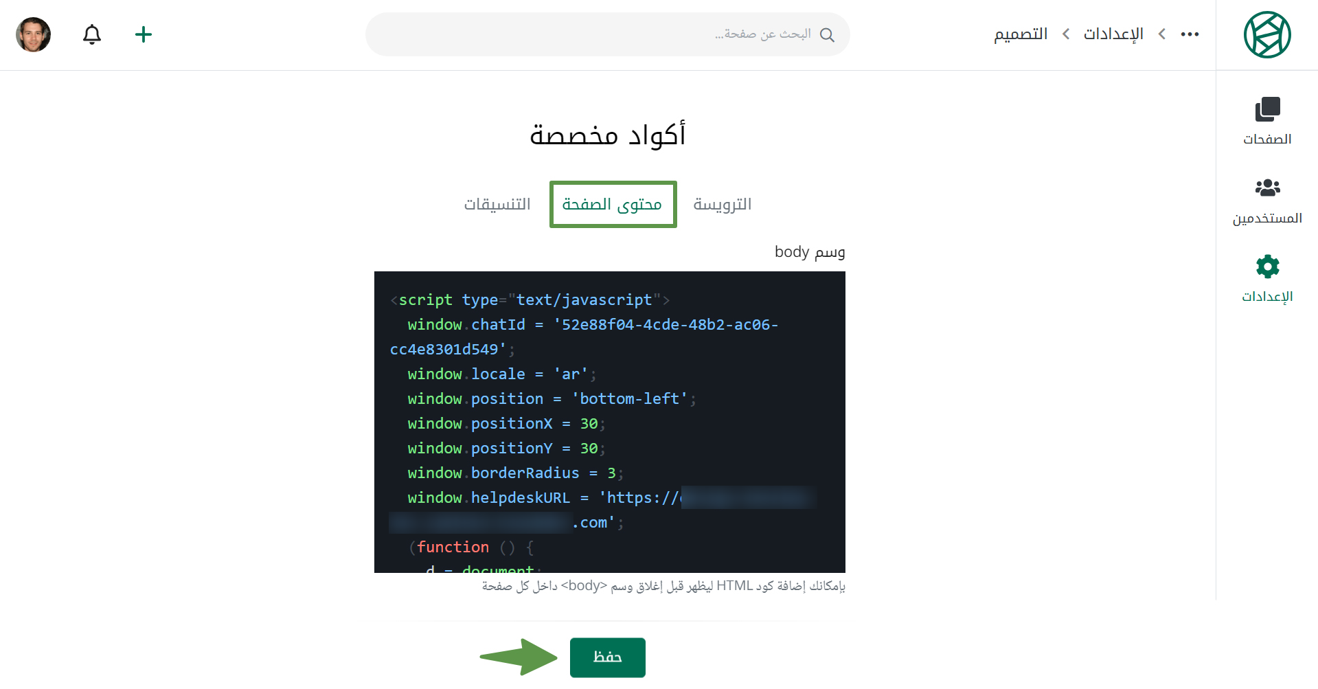 قم بلصق الكود في محتوى الصفحة، ليظهر قبل إغلاق وسم <body> داخل كل صفحة من صفحات موقعك، ثم اضغط حفظ.