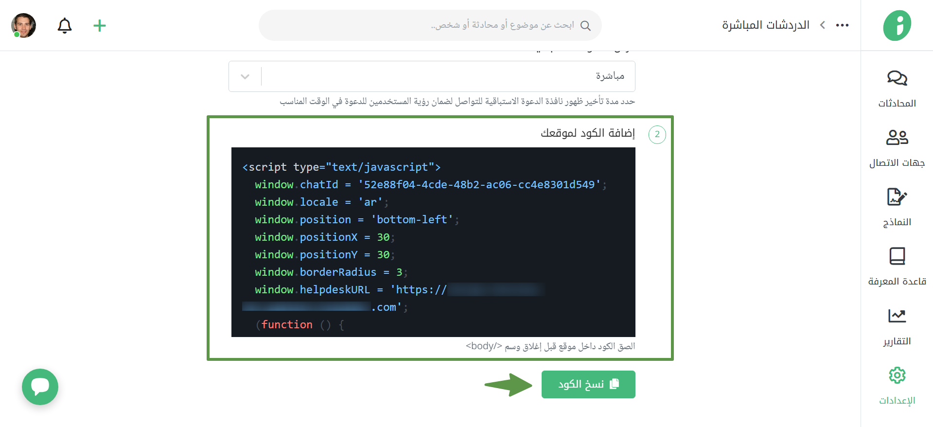 من إعدادت البدء يمكنك تخصيص كود الدردشة المباشرة بما يناسب إعدادت موقعك كإضافة النطاقات وتحديد مكان ظهور الأيقونة في موقعك على سنديان، ومن ثم اضغط على نسخ الكود.